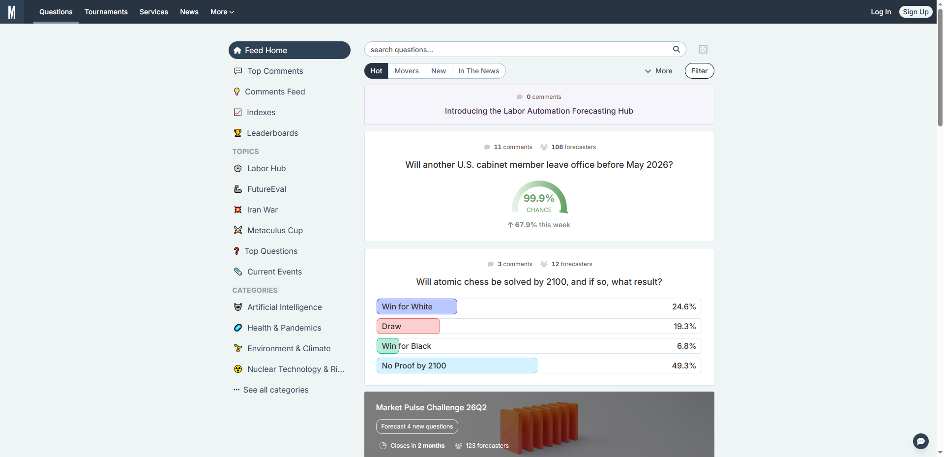Key Features & Functionalities Comprehensive Forecast Types: Supports Binary outcomes, Continuous Numeric ranges, and Date distributions. Weighted Consensus Engine: Built-in Bayesian aggregation algorithms that weigh user input based on their historical track record (Brier Scores). Performance Analytics: Automated calibration curves and accuracy tracking for every user, ensuring the highest data quality. Gamification & Engagement: Includes leaderboards, reputation points (XP), achievement badges, and a robust discussion forum. SEO & Performance Optimized: SSR (Server-Side Rendering) enabled for fast indexing. Optimized for "Question" and "Dataset" schema markups to dominate Search Engine Results Pages (SERPs).